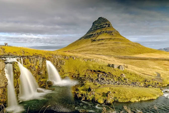 Kirkjufell is an iconic, church steeple-shaped mountain, and Kirkjufellsfoss is a nearby three-tiered waterfall. Together, this mountain and waterfall combination creates one of the most famous and photographed landscapes in Iceland, located on the Snæfellsnes Peninsula