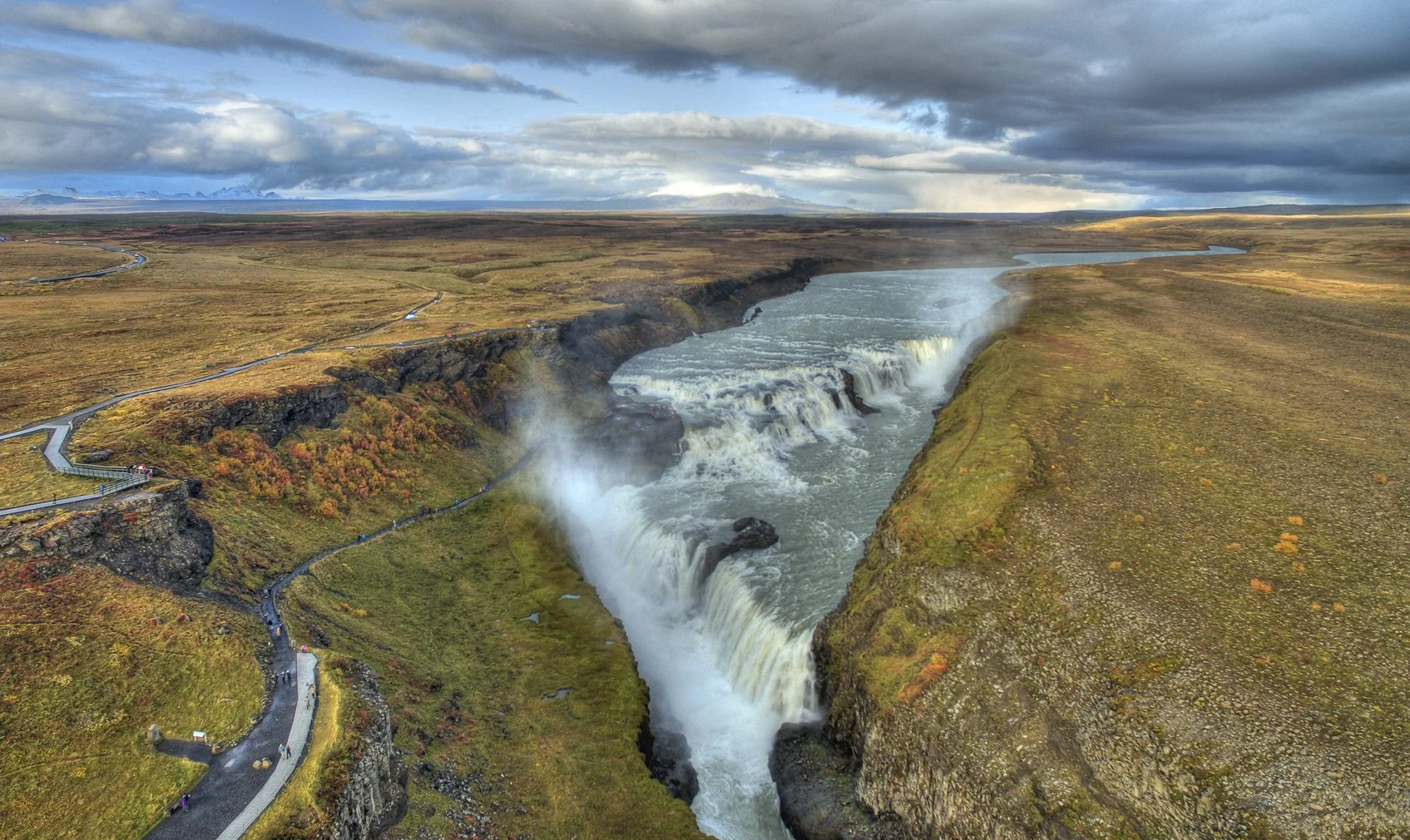 To complete what is known as the Golden Circle Route Tour we would travel to Gullfoss, a powerful waterfall that cascades 105’ into a canyon